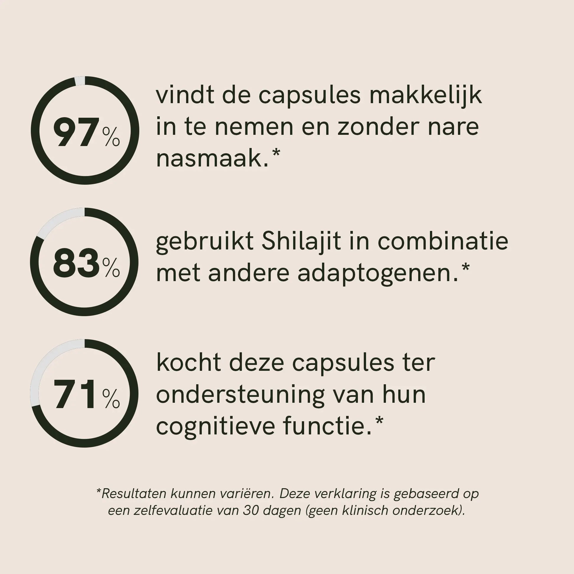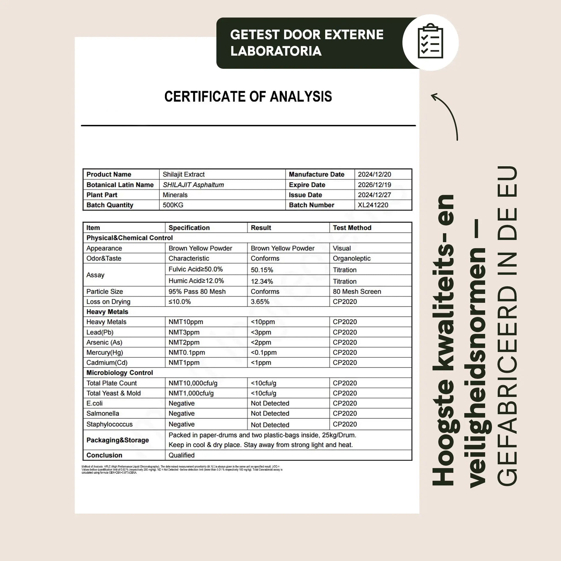 - Extract in verhouding 50:1 (komt overeen met 25.000 mg Shilajit-hars per capsule)