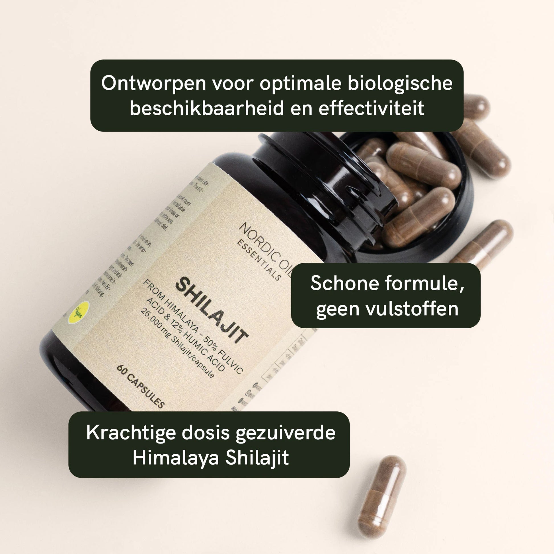Onze Shilajit-capsules zijn afkomstig uit de ongerepte regio’s van de Himalaya en bevatten 500 mg Shilajit-extract per capsule in een verhouding van 50:1, wat overeenkomt met 25.000 mg Shilajit-hars. Elke capsule levert ongeveer 12.500 mg fulvinezuur en 3.000 mg humuszuur. Het zorgvuldig gezuiverde extract is ontwikkeld voor optimale biologische beschikbaarheid en werkzaamheid.