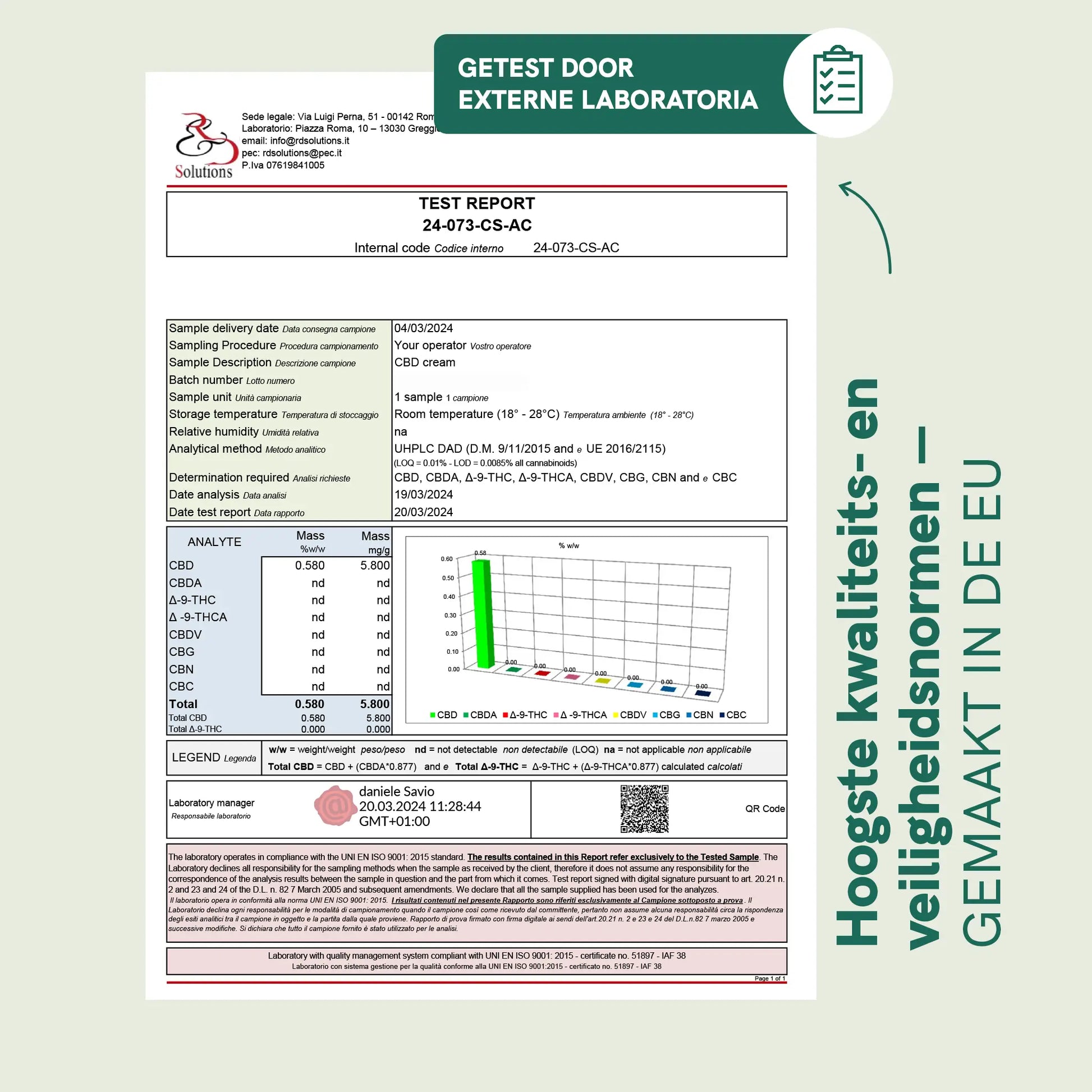 Aqua, Cetearyl Alcohol, Glycerine, Lecithine, Cannabis Sativa Zaadolie, Glyceryl Stearaat, Helianthus Annuus Hybrid Olie, Simmondsia Chinensis (Jojoba) Zaadolie, Alcohol Denat., Cetyl Palmitate, Macadamia Integrifolia/Tetraphylla Zaadolie, Butyrospermum Parkii (Shea) Boter, Avena Sativa (Haver) Meel (2%), Stearinezuur, Cetyl Alcohol, Stearyl Alcohol, Inositol, Cannabidiol, Sodium Cetearyl Sulfate, Gadi lecur Olie, Kaliumsorbaat, Natriumbenzoaat, Melkzuur, Xanthaangom, Glycine Soja Olie, Levulinezuur, Aloe Barbadensis Bladsap Poeder, Rosmarinus Officinalis (Rozemarijn) Bladolie, Natriumlevulinaat, Ascorbyl Palmitate, Limonene, Daucus Carota Sativa Wortel Extract, Tocopherol, Linalool