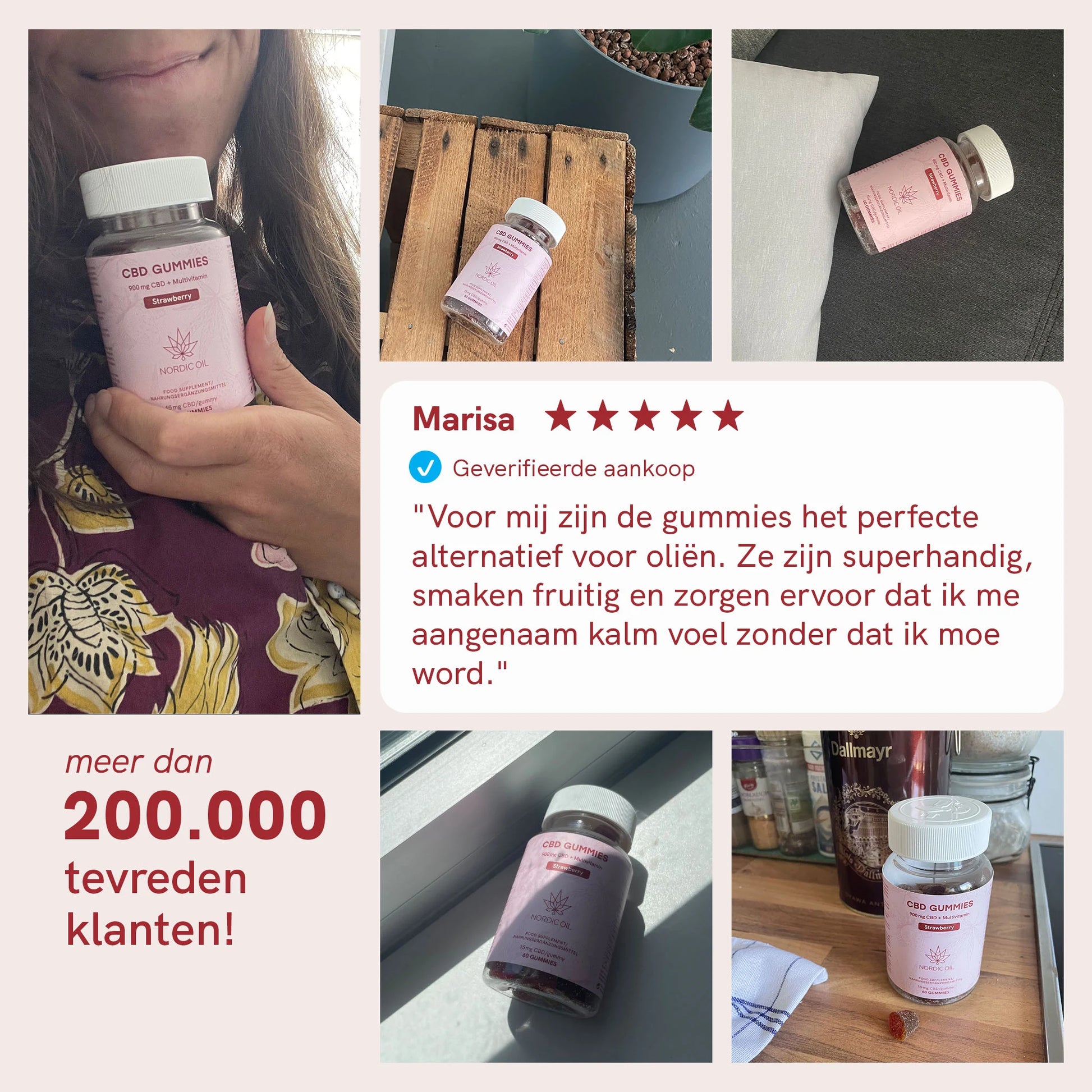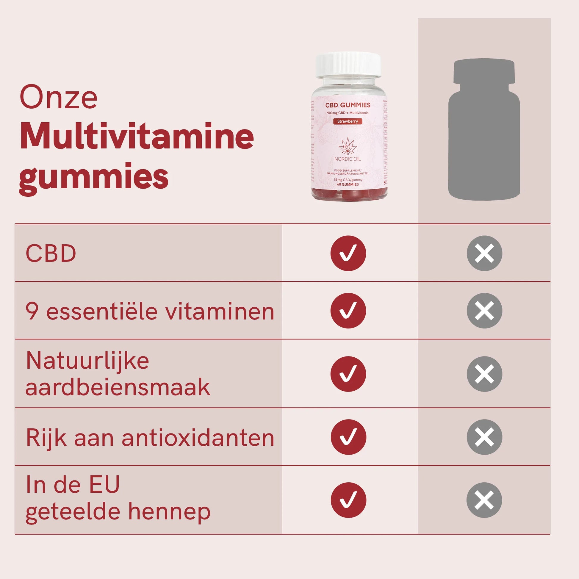 Deze gummies met aardbeiensmaak en multivitaminen zijn ideaal voor iedereen die op zoek is naar een lekker en gemakkelijk in te nemen alternatief voor CBD-olie of softgels. Door de multivitamine-inhoud worden ze vaak gebruikt om het immuunsysteem te versterken en een gezonde huid te bevorderen.