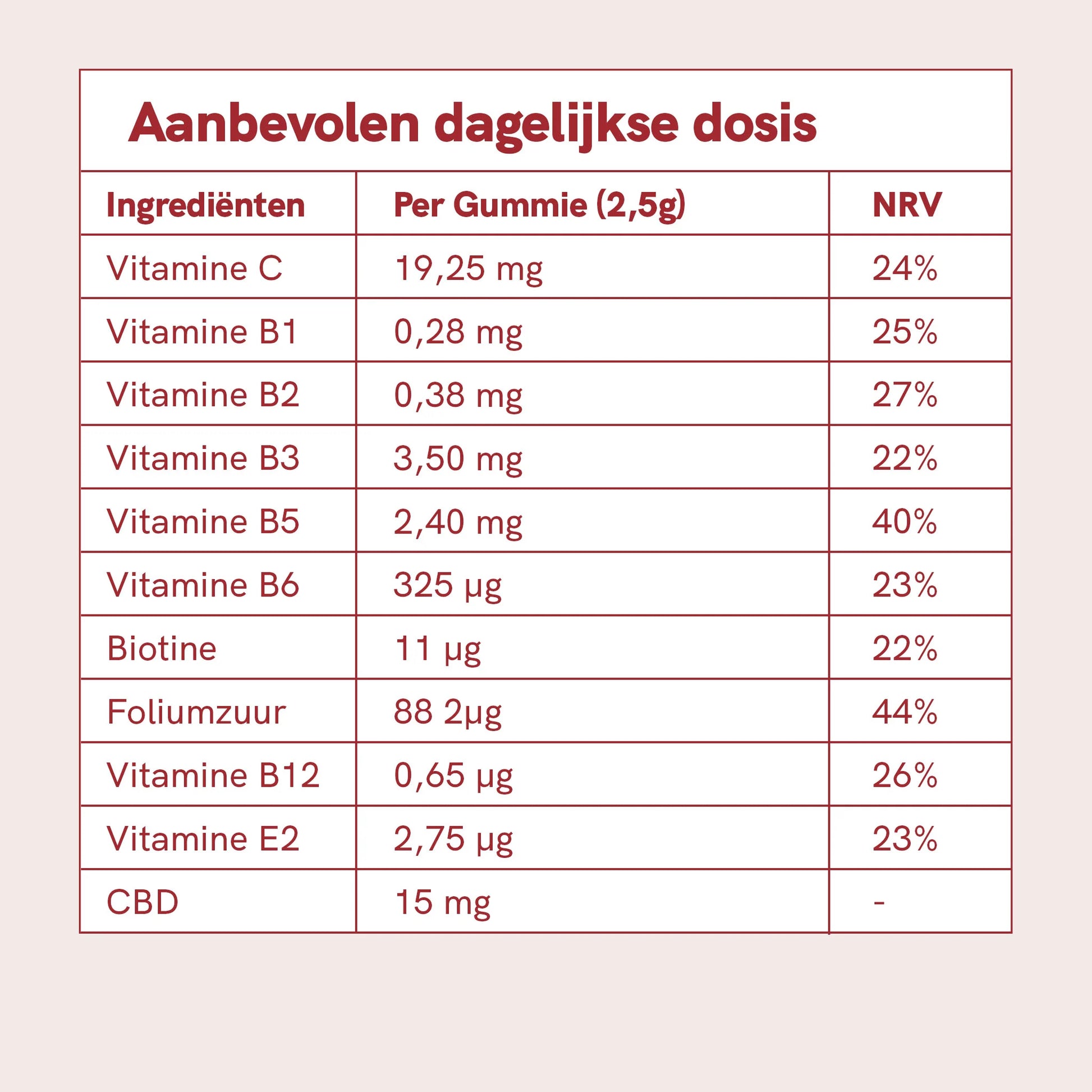Kauw 1-4 gummies per dag, tenzij anders geadviseerd door uw arts. De maximale dagelijkse dosering van 4 gummies mag niet worden overschreden. 1 gummie = 15 mg CBD