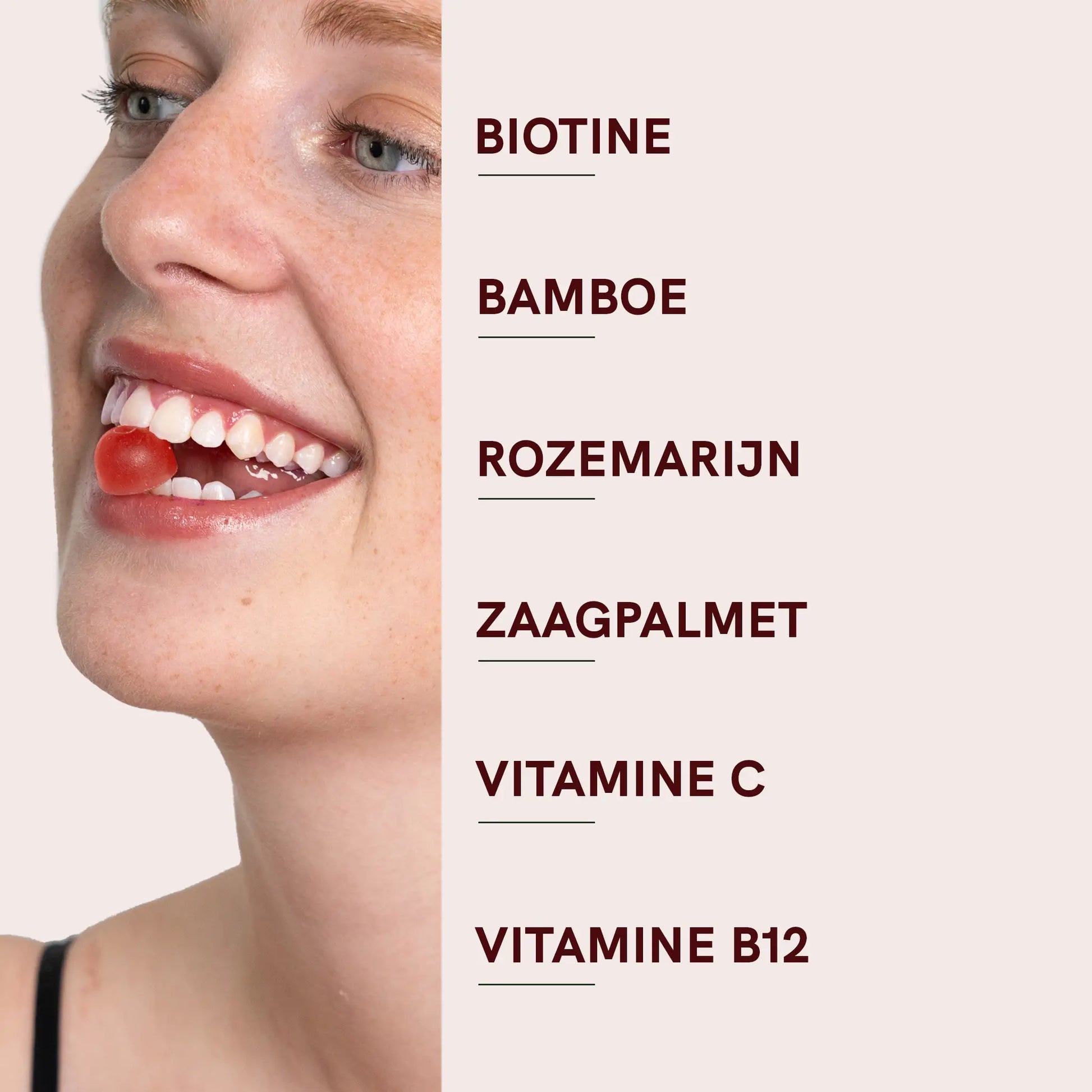 Elke pot bevat 60 vegan gummies, met zorg geproduceerd in de EU en volledig suikervrij. De formule combineert vitamines die bekend staan om hun rol bij het behoud van huid, haar en nagels met krachtige plantenextracten zoals acerola, bamboe en rozemarijn.