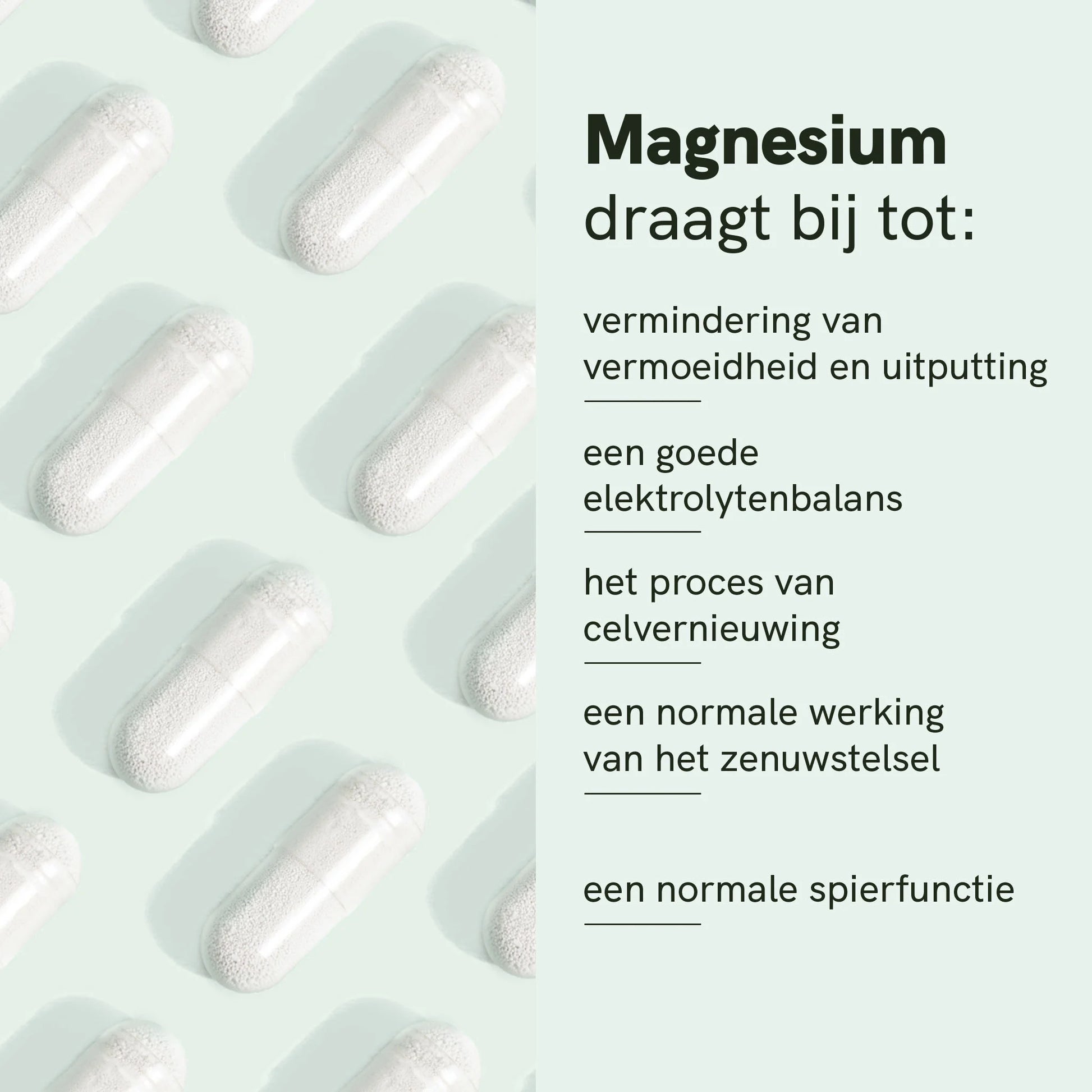 Magnesium is een essentieel mineraal dat bijdraagt aan het verminderen van vermoeidheid en moeheid, het elektrolytenevenwicht ondersteunt en een rol speelt bij de normale werking van de spieren. Bovendien draagt het bij aan de normale werking van het zenuwstelsel en de psychologische functies.
