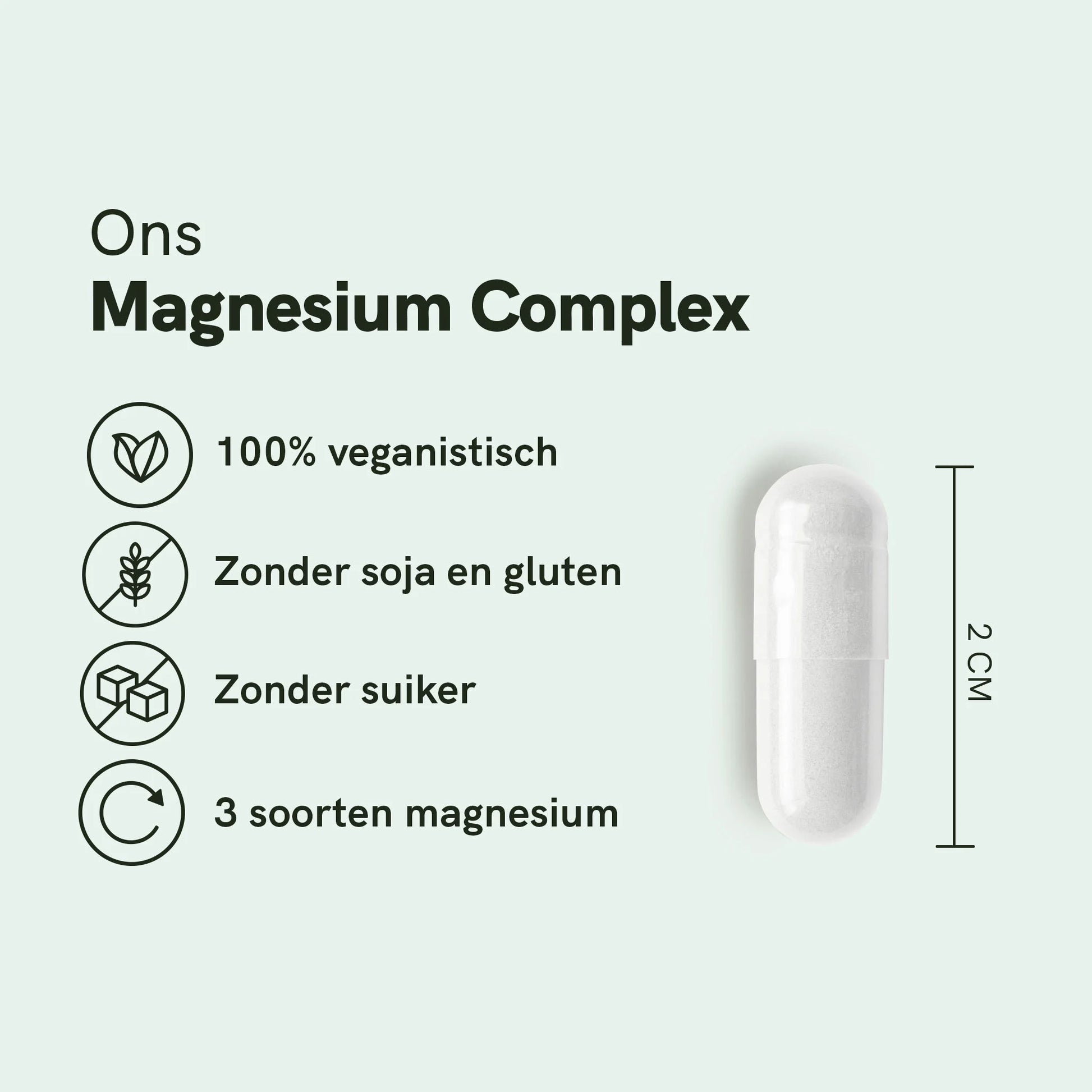 Onze Magnesiumcomplex capsules bevatten een zorgvuldig uitgebalanceerde mix van magnesiumbisglycinaat, magnesiumcitraat en magnesiumtauraat. Deze drie goed opneembare vormen zorgen voor een uitstekende biologische beschikbaarheid en ondersteunen meerdere functies in het lichaam.