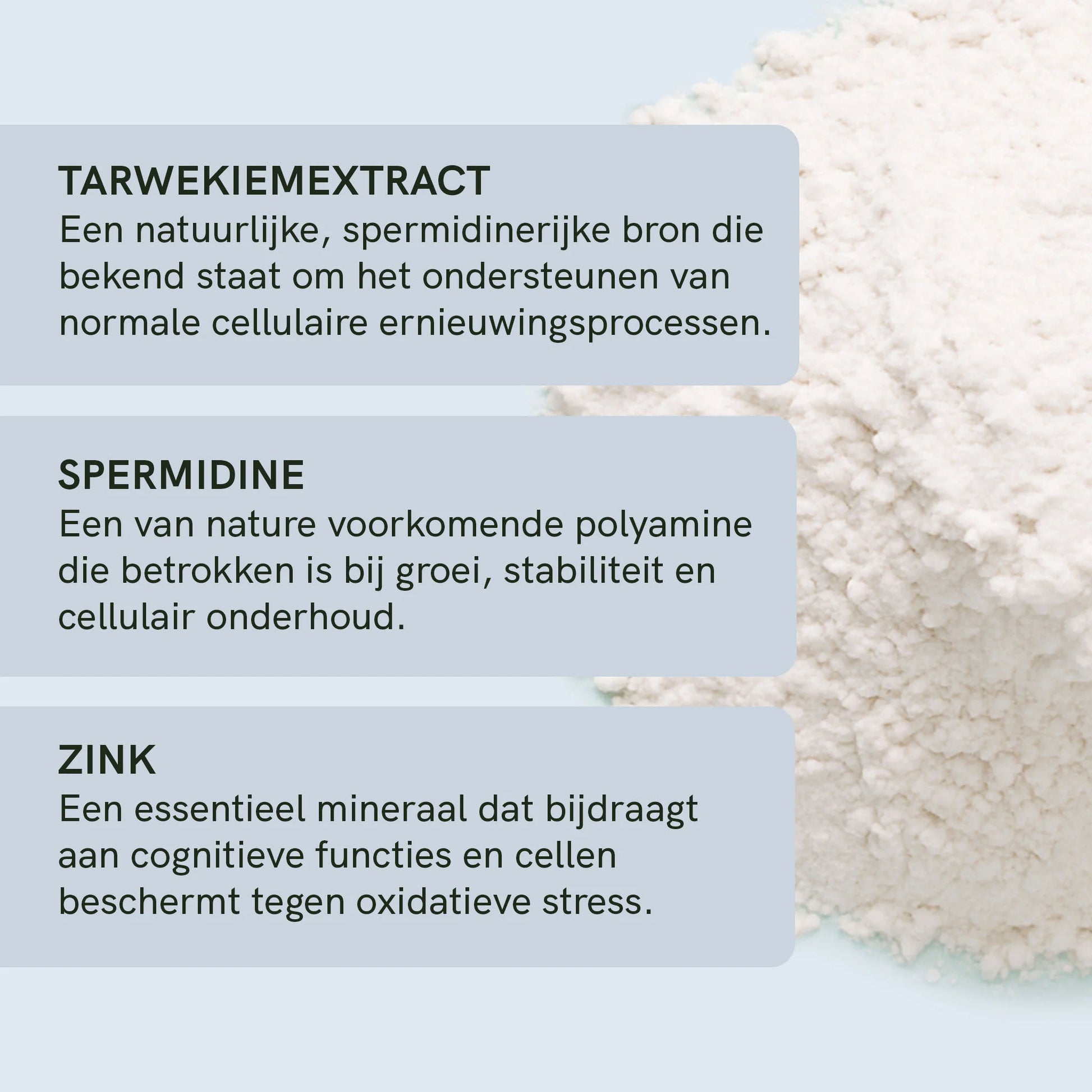 - Tot 6 mg spermidine + 4,5 mg zink per dagelijkse dosering
