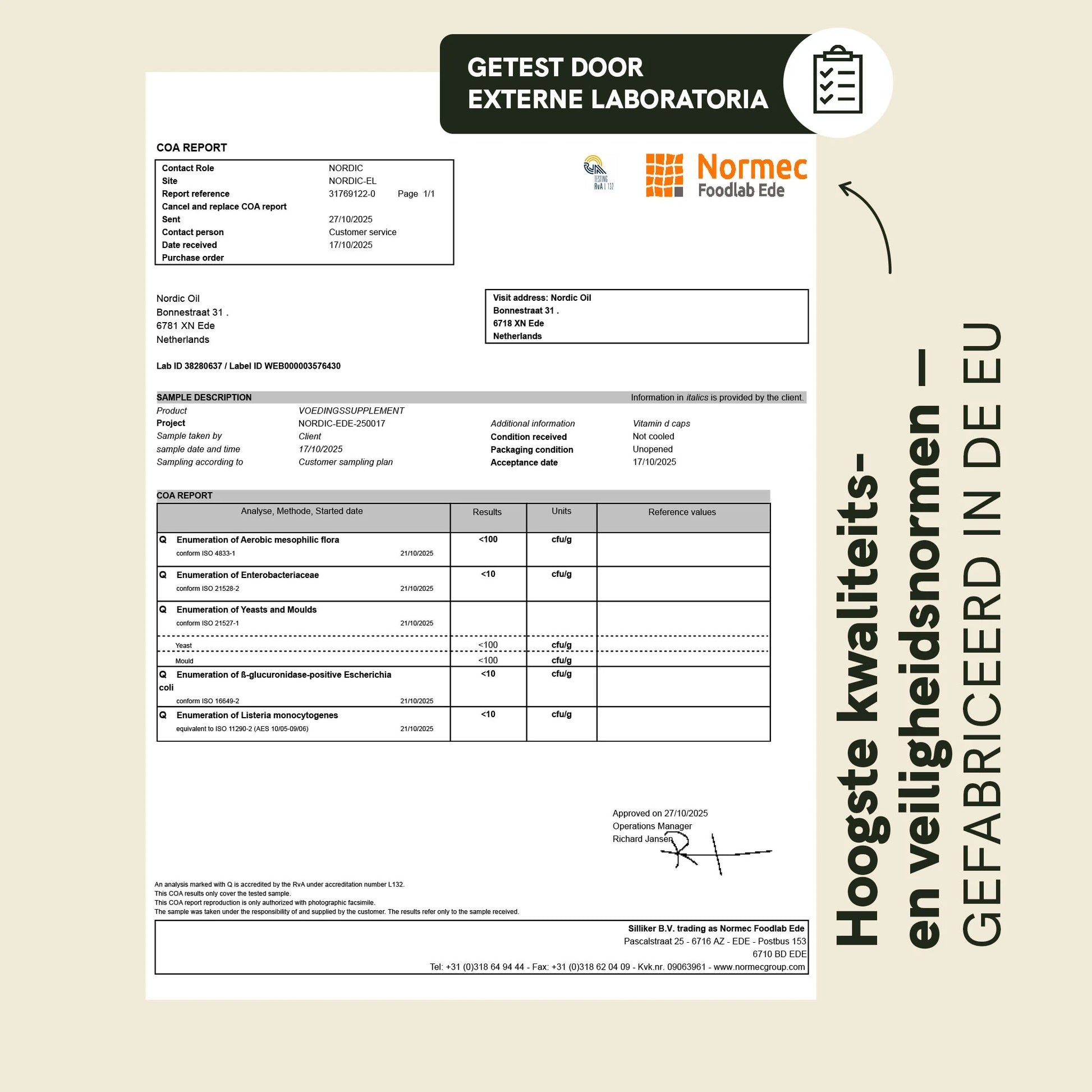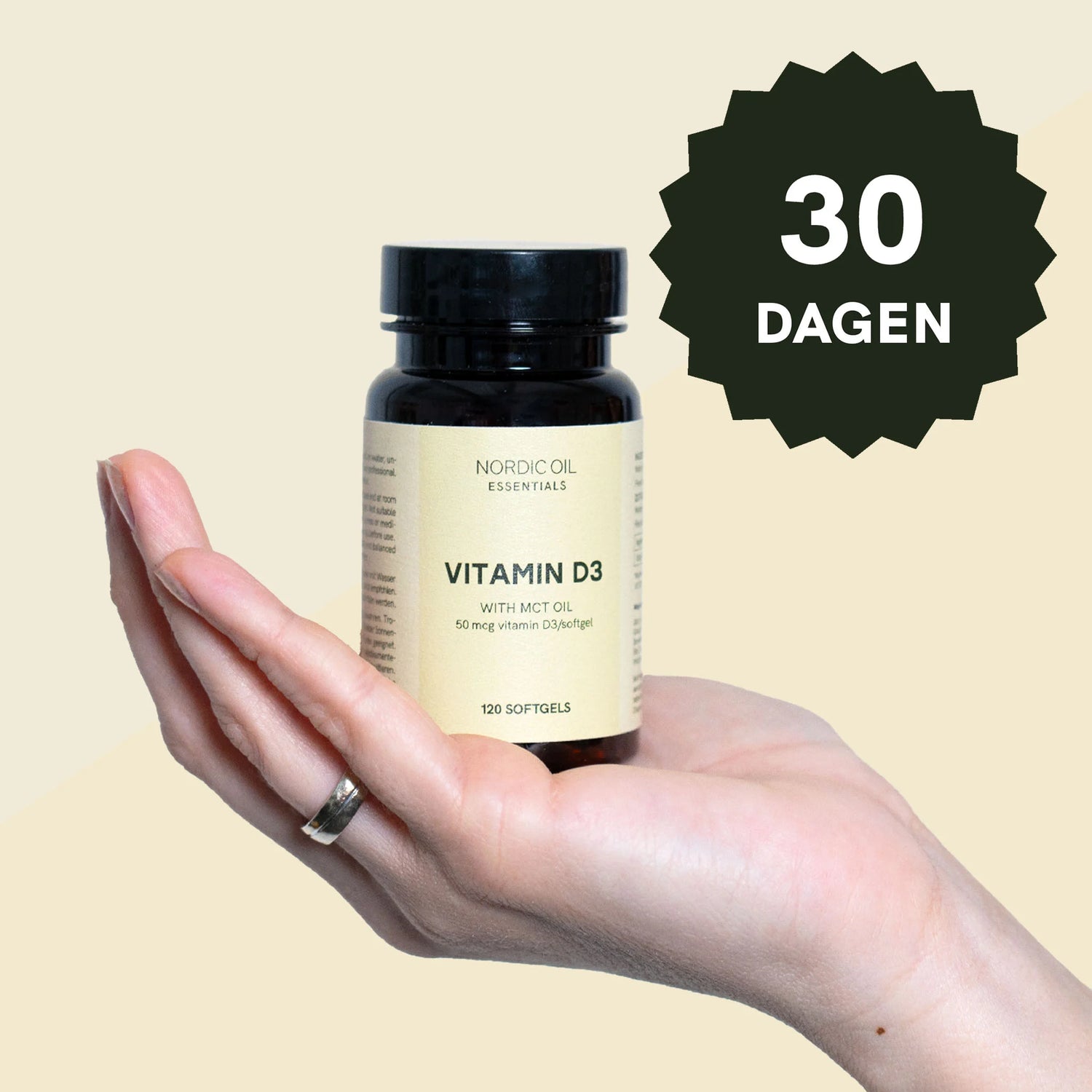 Nordic Oil Vitamine D3 Capsules zijn een voedingssupplement. Iedere capsule bevat Vitamine D3, een voedingsstof die bijdraagt aan het behoud van normale botten en tanden, en een normale werking van het immuunsysteem. Elke verpakking bevat 120 softgel capsules, genoeg voor vier maanden. Deze Vitamine D3-capsules zijn veganistisch, gemaakt in de EU en nauwkeurig getest in een laboratorium om de hoogste kwaliteit te garanderen. Ze zijn vrij van kunstmatige smaak- en kleurstoffen en gebruiken MCT-olie van kokosnoten voor een verbeterde opname. Dit product kan onderdeel zijn van je dagelijkse routine ter ondersteuning van je vitamine D-inname.