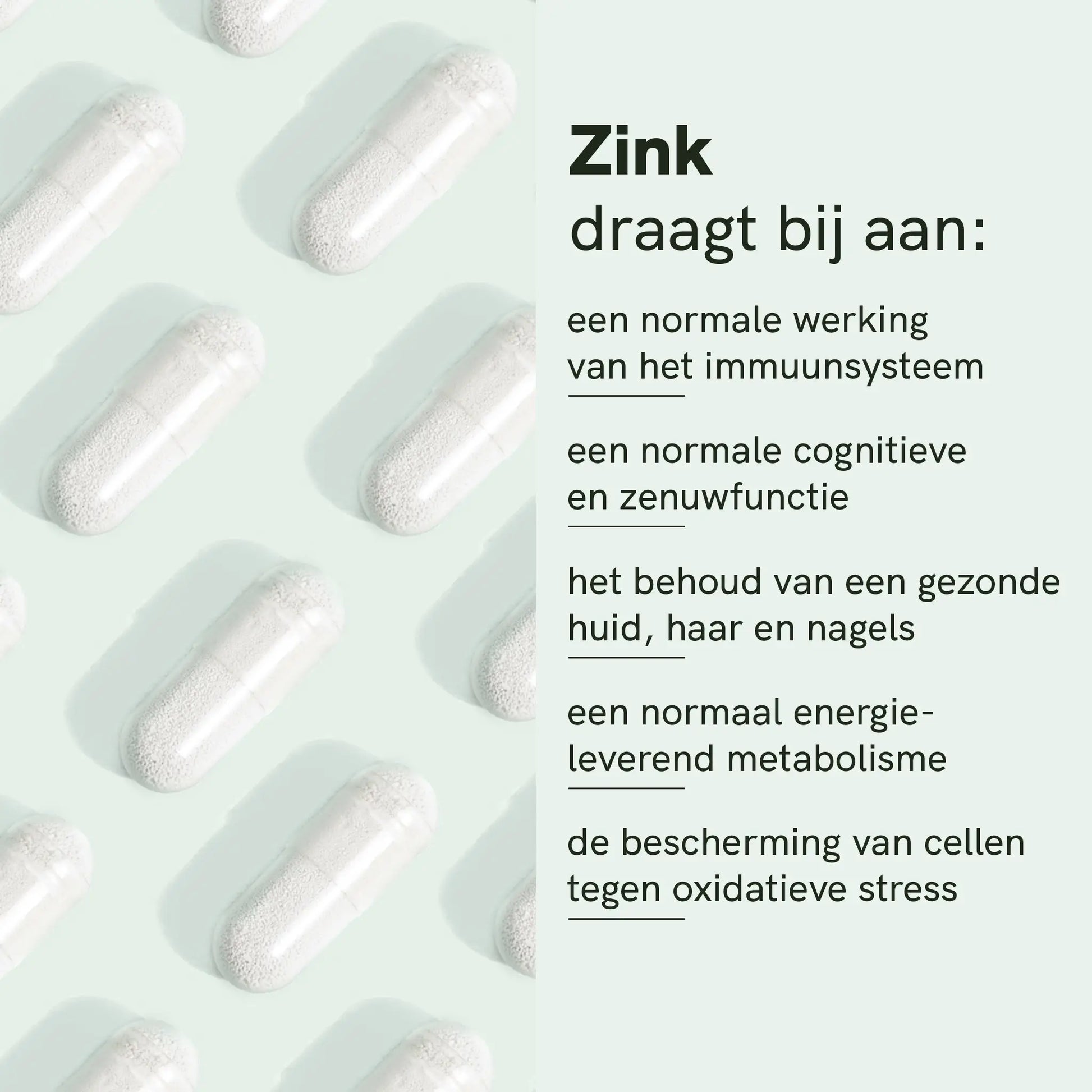 Zink is een essentieel mineraal dat een belangrijke rol speelt in veel lichaamsfuncties. Het innemen van zinkcapsules kan je immuunsysteem ondersteunen, een gezonde huid bevorderen en bijdragen aan een normale cognitieve functie. Zink bevordert ook wondgenezing, de hormoonproductie en de gezondheid van haar, huid en nagels. Regelmatige zinkinname kan je algehele welzijn en gezondheid bevorderen.