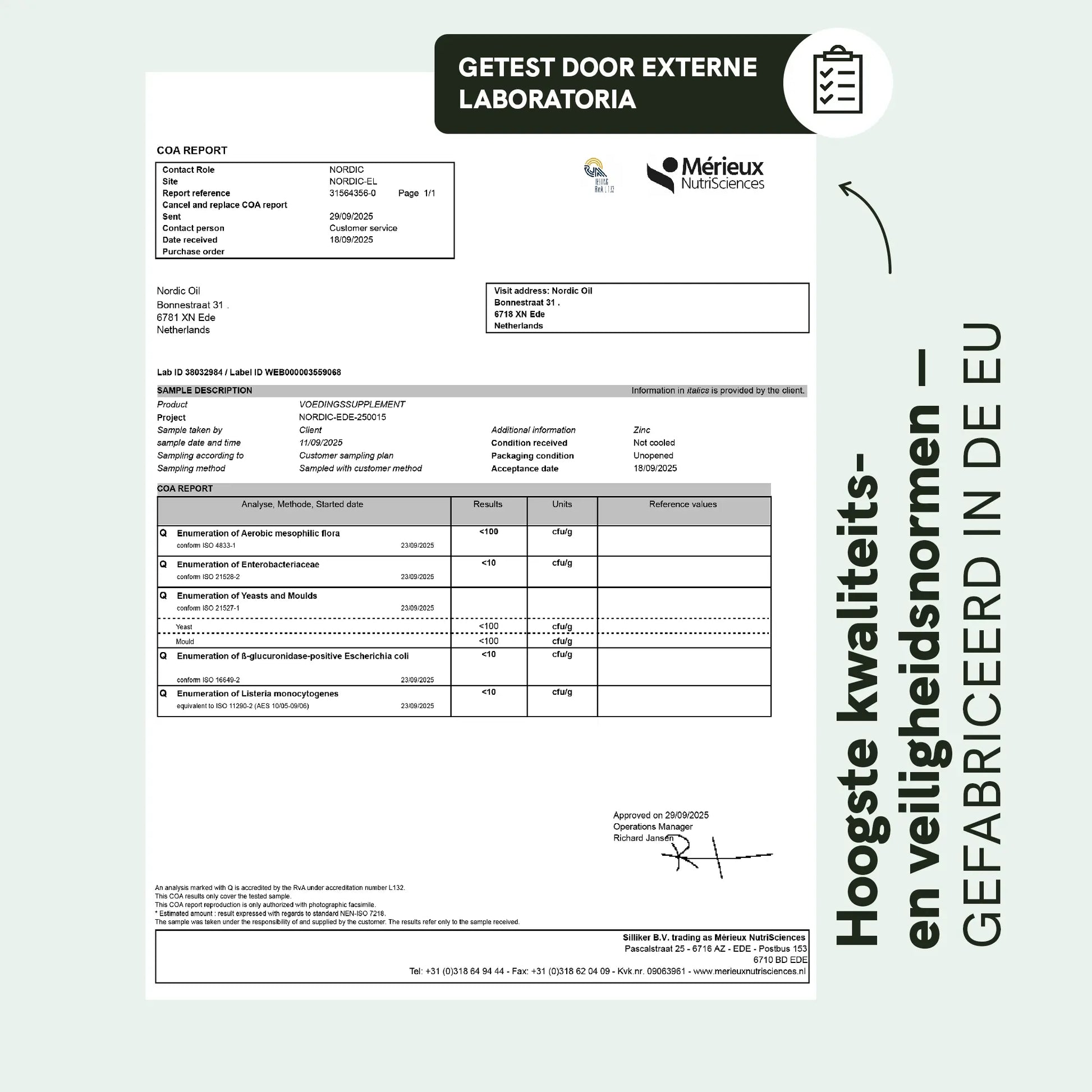 | Elementair Zink (van 60 mg Zinkbisglycinaat) | 15 mg | 150% |